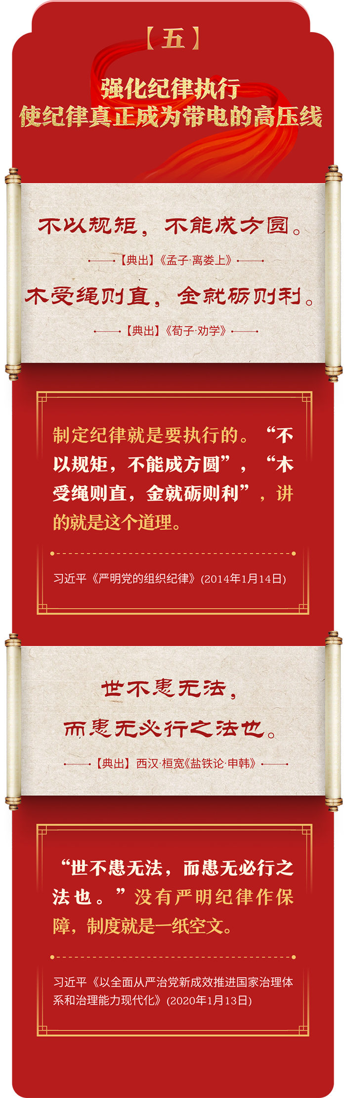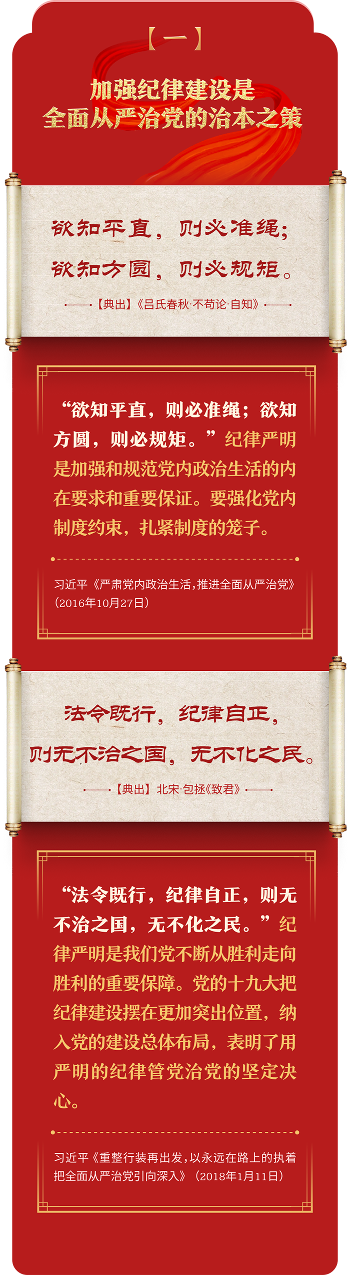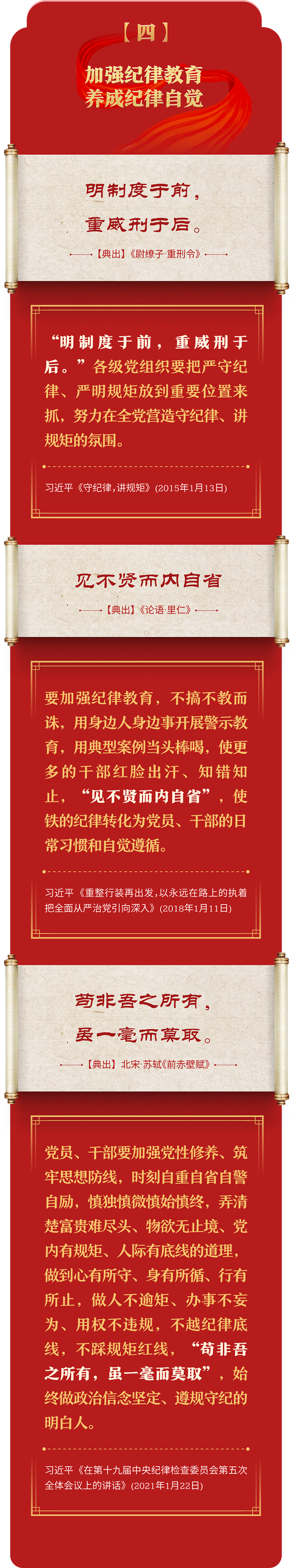 編者按:加強紀律建設(shè)是全面從嚴治黨的治本之策。黨的十八大以來,習近平總書記圍繞全面加強黨的紀律建設(shè)發(fā)表一系列重要論述,立意高遠,內(nèi)涵豐富,思想深刻,引導(dǎo)黨員干部學紀、知紀、明紀、守紀,真正把紀律規(guī)矩轉(zhuǎn)化為政治自覺、思想自覺、行動自覺,確保全黨目標一致、團結(jié)一致、步調(diào)一致。在這些重要論述中,總書記精妙運用古代典籍經(jīng)典名句,以古喻今、啟迪思想、激蕩精神,讓我們一起來學習!
