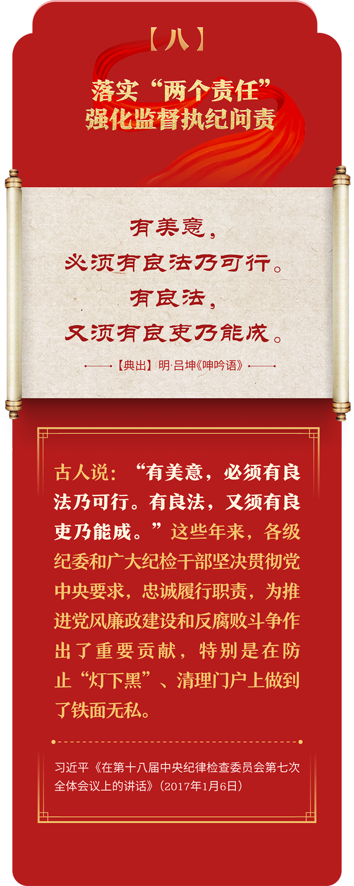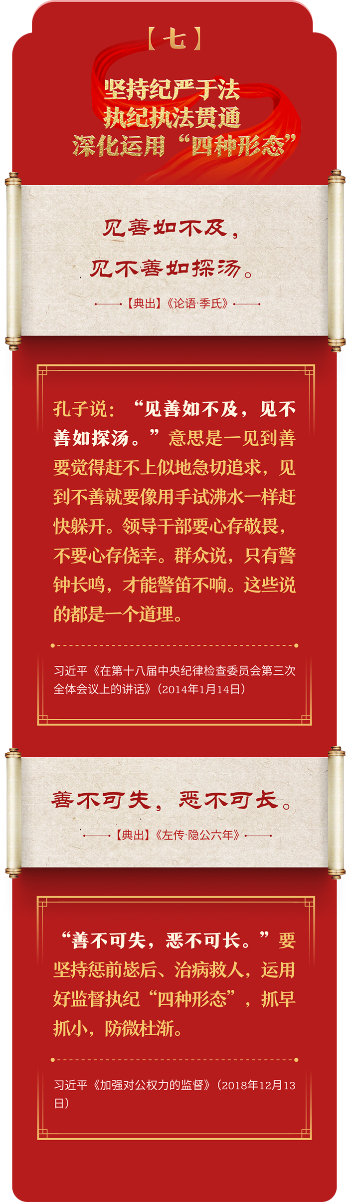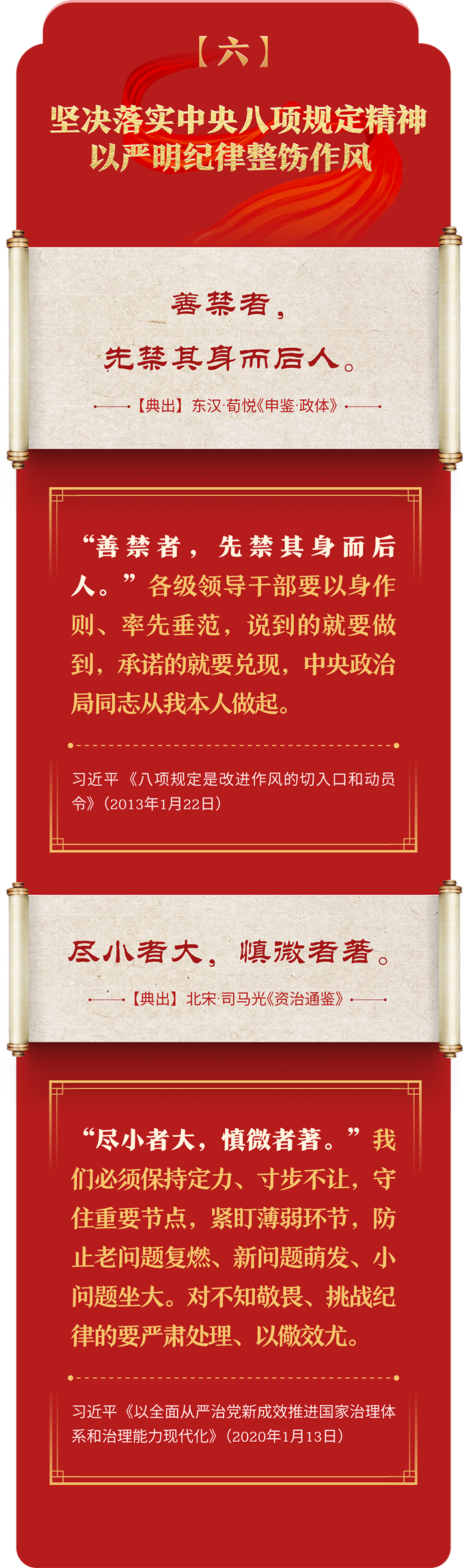 編者按:加強紀律建設(shè)是全面從嚴治黨的治本之策。黨的十八大以來,習近平總書記圍繞全面加強黨的紀律建設(shè)發(fā)表一系列重要論述,立意高遠,內(nèi)涵豐富,思想深刻,引導(dǎo)黨員干部學紀、知紀、明紀、守紀,真正把紀律規(guī)矩轉(zhuǎn)化為政治自覺、思想自覺、行動自覺,確保全黨目標一致、團結(jié)一致、步調(diào)一致。在這些重要論述中,總書記精妙運用古代典籍經(jīng)典名句,以古喻今、啟迪思想、激蕩精神,讓我們一起來學習!