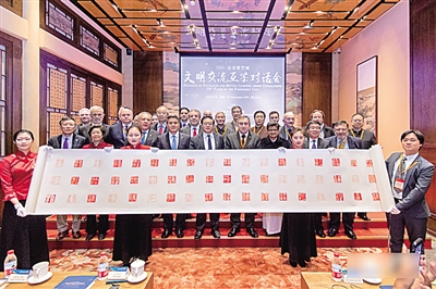圖為閉幕式上,與會(huì)嘉賓展示書法版《文明交流互鑒對(duì)話會(huì)北京宣言》。藺紫鷗供圖