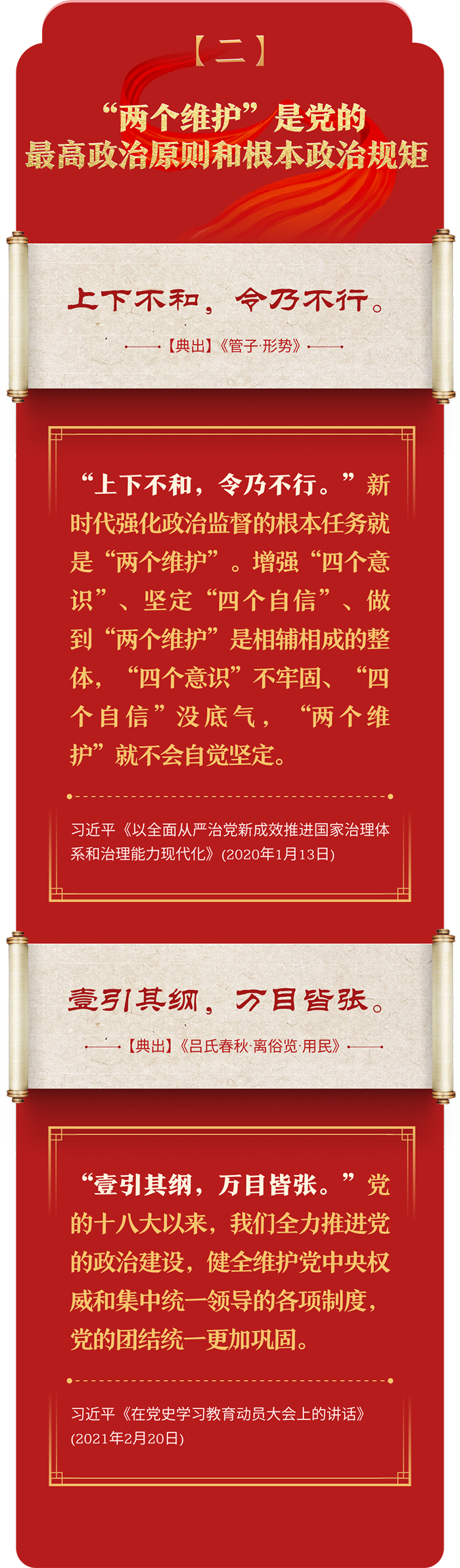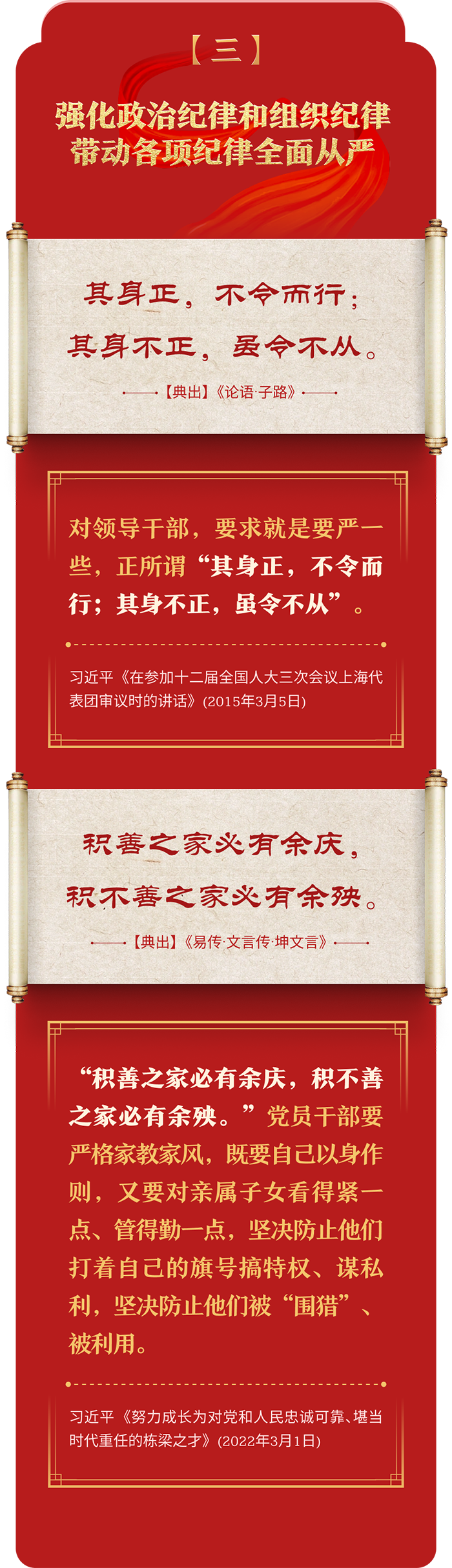 編者按:加強紀律建設(shè)是全面從嚴治黨的治本之策。黨的十八大以來,習近平總書記圍繞全面加強黨的紀律建設(shè)發(fā)表一系列重要論述,立意高遠,內(nèi)涵豐富,思想深刻,引導(dǎo)黨員干部學紀、知紀、明紀、守紀,真正把紀律規(guī)矩轉(zhuǎn)化為政治自覺、思想自覺、行動自覺,確保全黨目標一致、團結(jié)一致、步調(diào)一致。在這些重要論述中,總書記精妙運用古代典籍經(jīng)典名句,以古喻今、啟迪思想、激蕩精神,讓我們一起來學習!